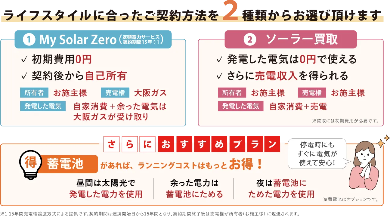 太陽光発電設備自己保有モデルMy Solar Zeroとは、売電権を活用した初期費用ゼロの太陽光発電設備自己保有モデルで、大阪ガスの「スマイルーフ」を用いた太陽光サービスです。設備を第三者が所有・管理し、利用者が電気の購入やリース料を支払うPPA(電力購入契約)やリースとは異なり、My Solar Zeroは設備の所有権が最初からお施主様にあります。太陽光発電設備を「導入すること」だけでなく、その創エネルギーを「どう使い、どう暮らすか」まで考えた選択肢としてご提案しています。